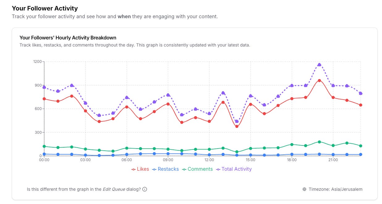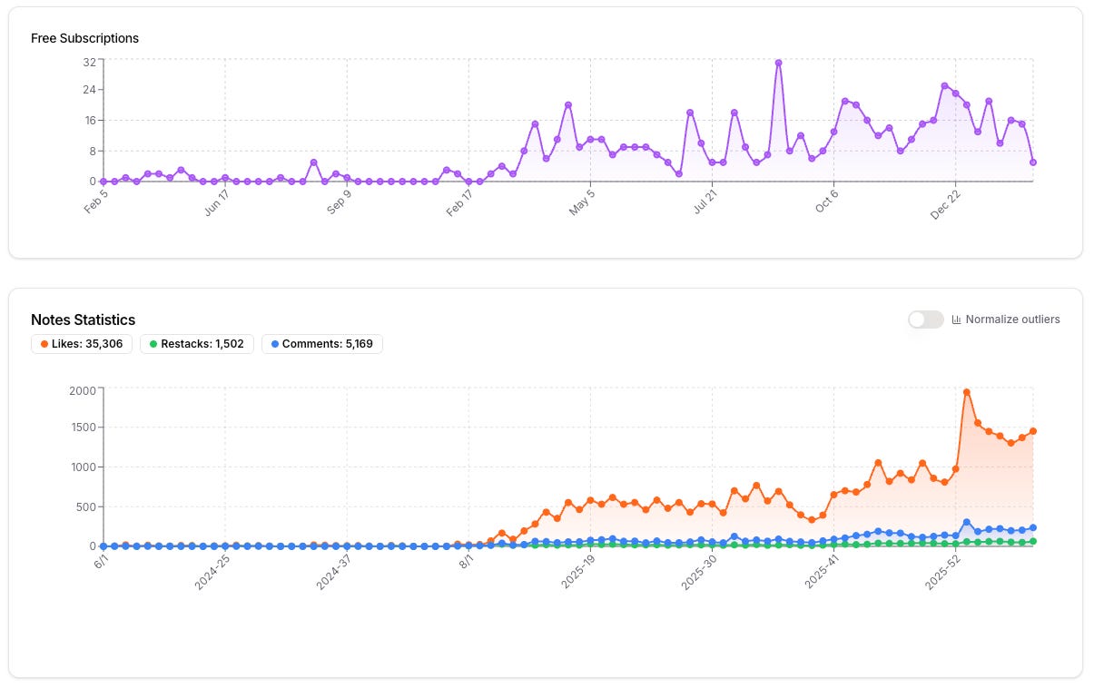 And if you want to test different things and see how your engagement changes over time, like posting 5 notes a day instead of 3, or changing the topics you write about, you can easily see how it affects your Substack.