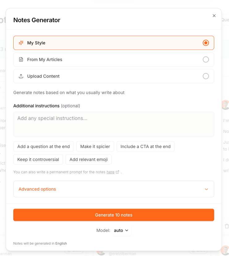A Note generator that learns your writing style and produces Notes that actually sound like you.
