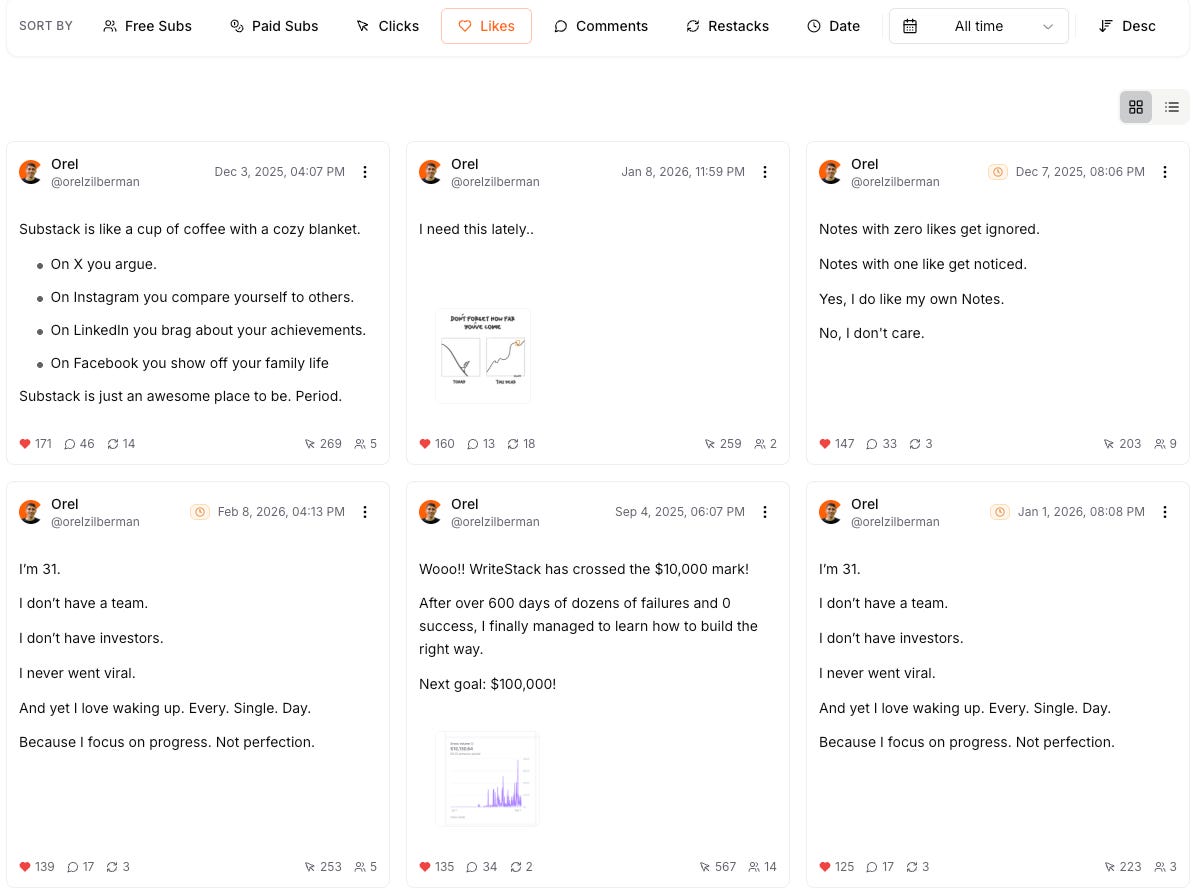 Instead of clicking into each Note one by one to find its stats, WriteStack gives you everything in a single view. All your Notes, all their numbers sortable.